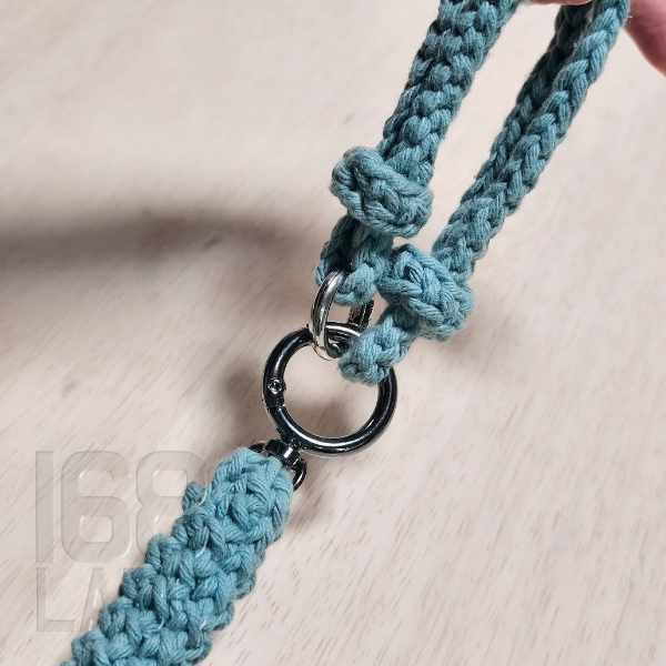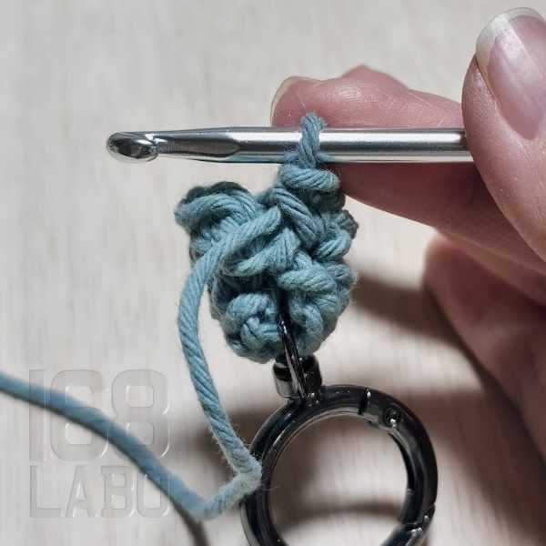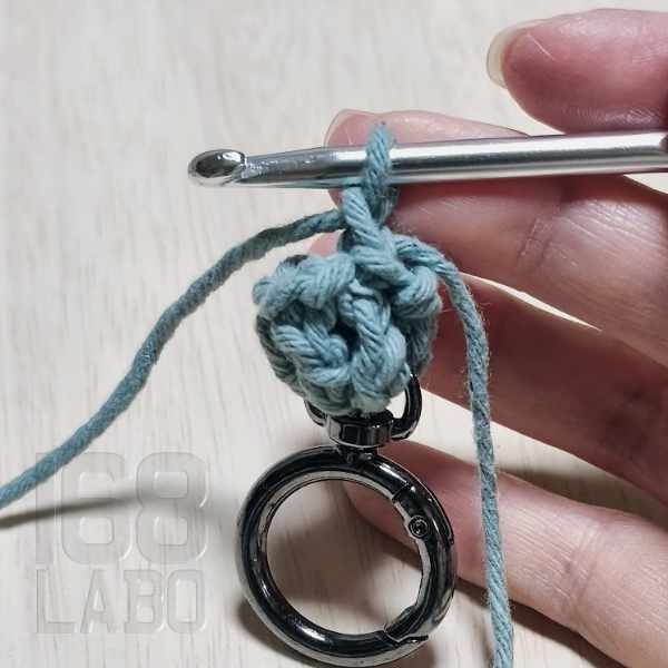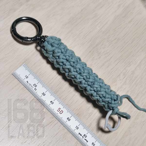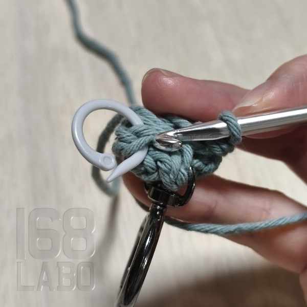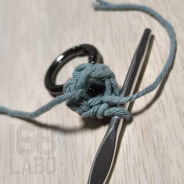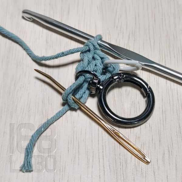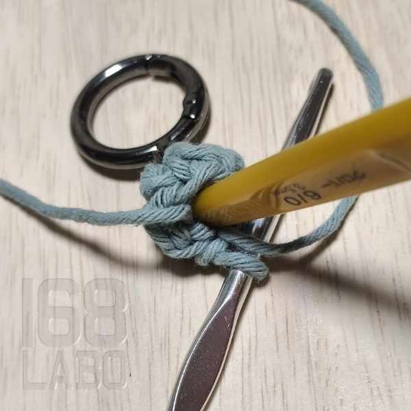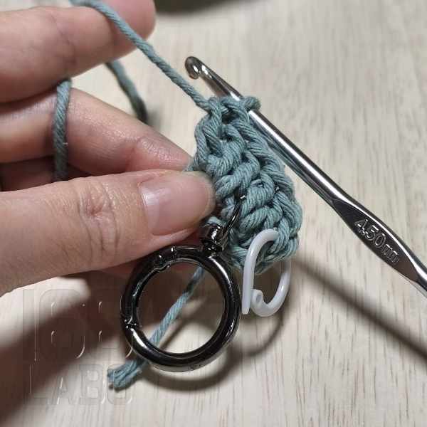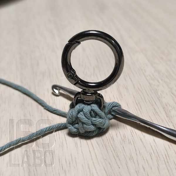 3目編んだら、回転カン付きのリングカラビナを仕込み、残りの3目を編んで引き抜き編みをします。