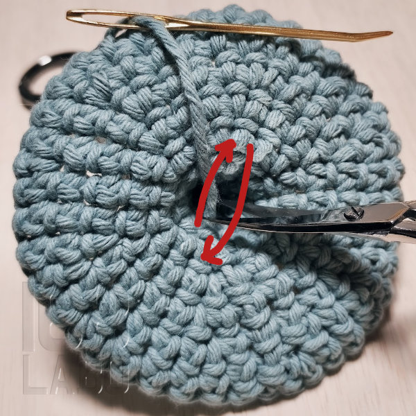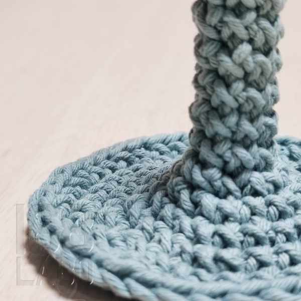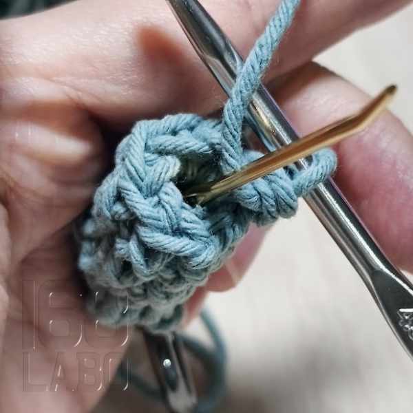 毎段引き抜き>立ち上がり をするには目数が少なく、ぼこぼこしてしまうため、立ち上がりをつくらずにぐるぐると編んでいきます。