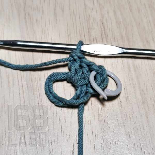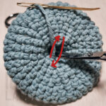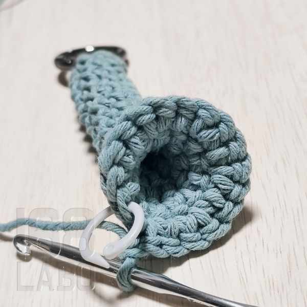 増し目をしますが、まだぐるぐる編みで進めるため1周が分かる様、前項の8cmぐらいになったところで、マーカーをしておきます。